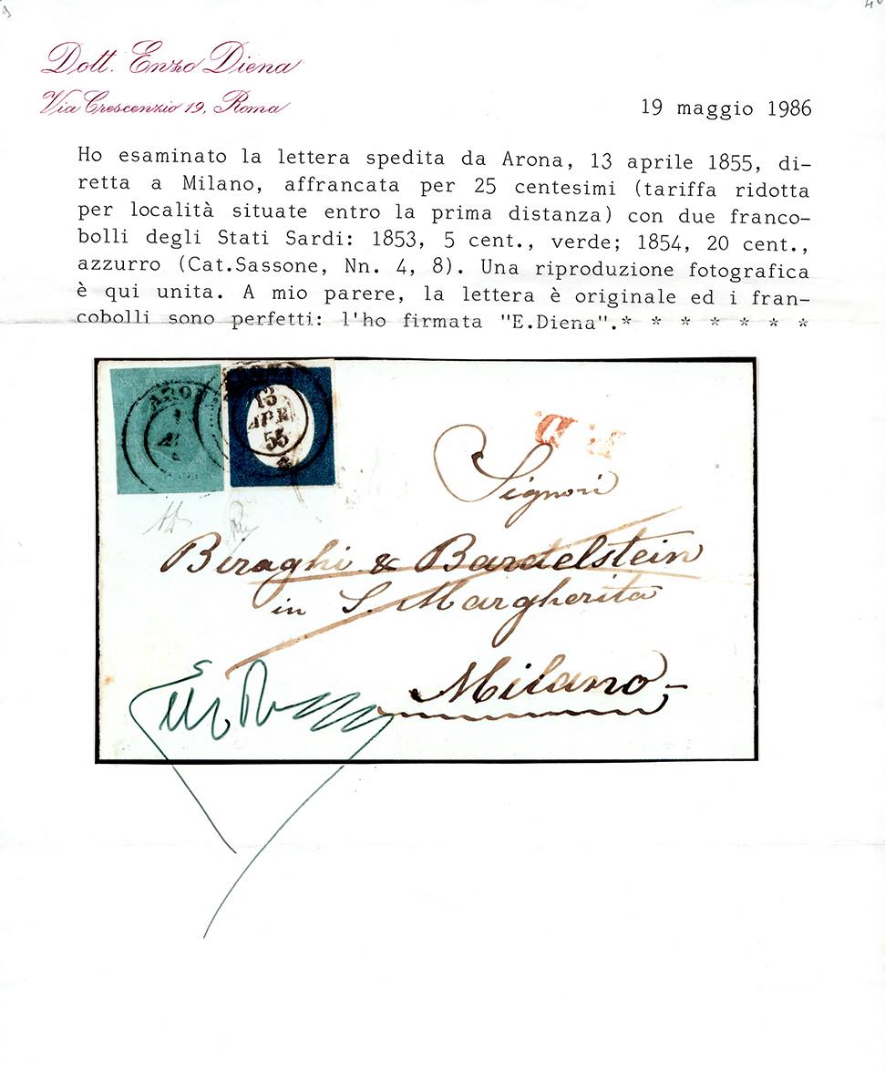 1855 - 5 cent. verde, II emissione, in affrancatura mista con 20 cent. azzurro, III emissione (4,8), perfetti, su lettera in tariffa ridotta entro la I distanza da Arona 13/4/1855 a Milano, bollo PD in rosso. Rara e di ottima qualità. Em. e A.Diena, cert. E.Diena.