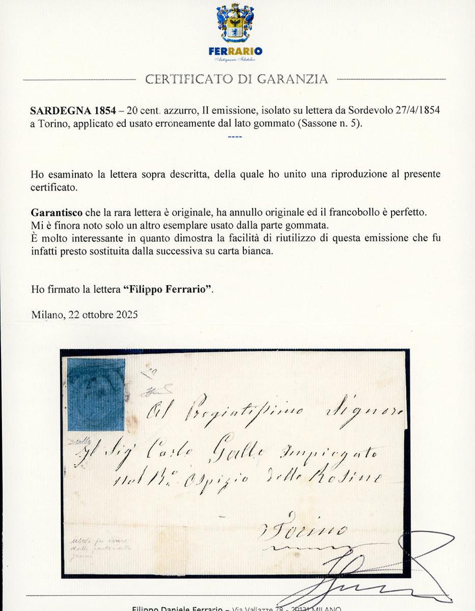 1854 - 20 cent. azzurro (5), bordo di foglio in alto, perfetto, applicato ed usato erroneamente dal lato gommato su lettera da Sordevolo 27/4/1854 a Torino. Molto interessante in quanto dimostra la facilità di riutilizzo di questa emissione, che fu intatti presto sostituita dalla successiva su carta bianca per evitare eventuali frodi. Uno dei due casi finora noti. Colla, cert. E.Diena e Ferrario.