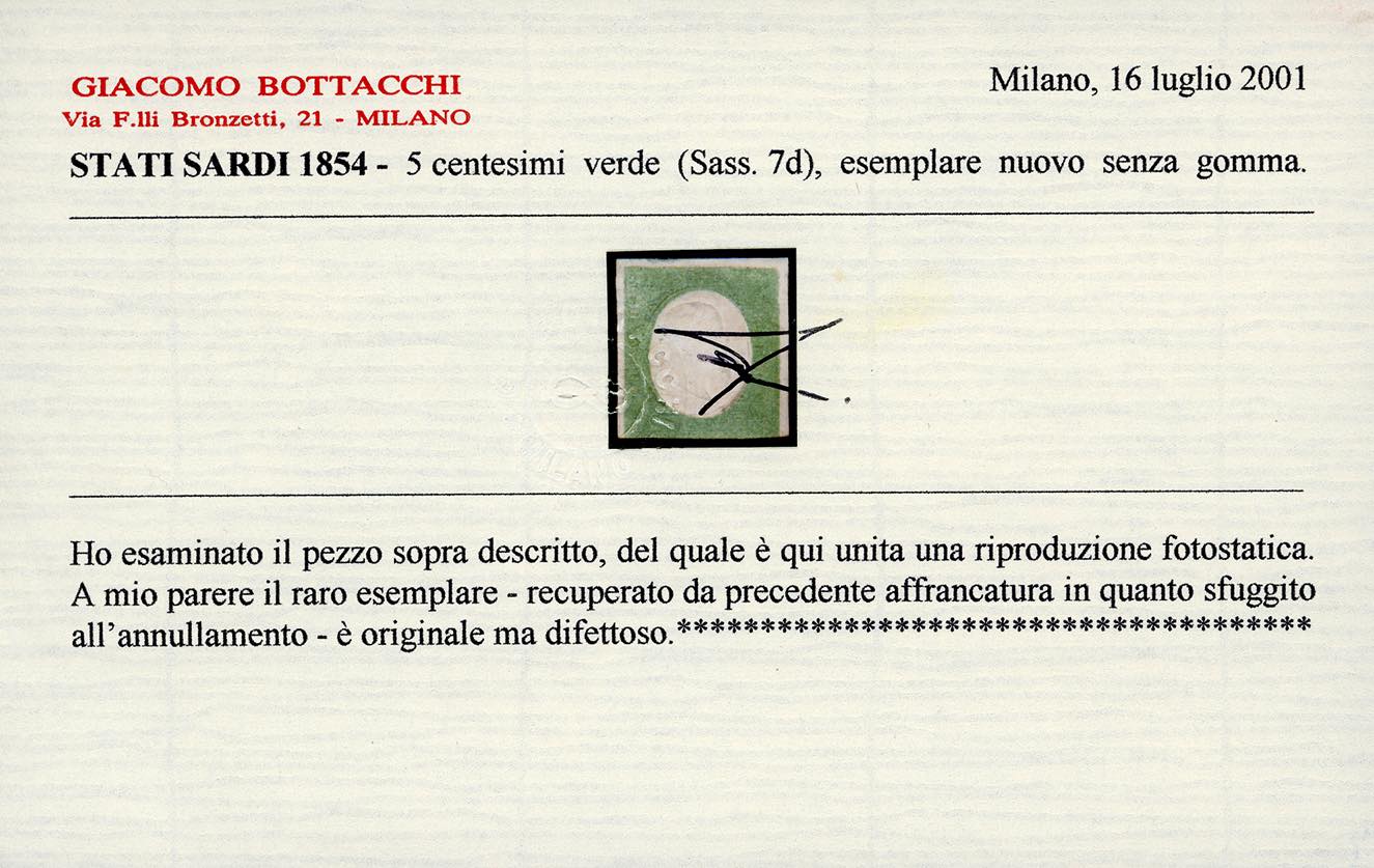 1854 - 5 cent. verde (7d), tre ottimi margini, leggermente intaccato in basso, nuovo, gran parte di gomma originale. Molto raro. Chiavarello. Ex coll. Imperato (cat. Sassone € 34.000/85.000). Cert. Ferrario e Bottacchi.