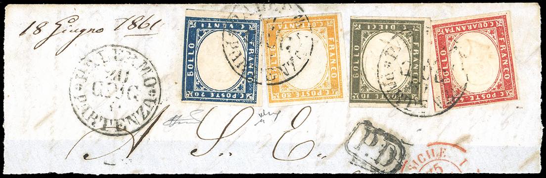 1861 - 10 cent. oliva grigio verdastro carico, 20 cent. azzurro oltremare, 40 cent. rosso vermiglio, 80 cent. giallo arancio (14Cba,15Dc,16Da,17C), perfetti ad eccezione del 10 cent. leggermente intaccato a destra, su ampio frammento di lettera da Palermo 20/6/1861. Bella e rara affrancatura quadricolore. Chiavarello, Ferrario.