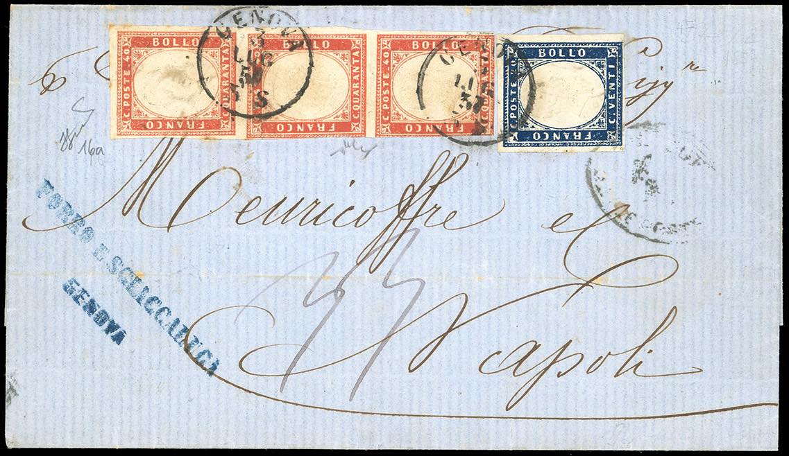 1857 - 40 cent. vermiglio, striscia verticale di tre, leggermente corta a sinistra, 20 cent. indaco, perfetto (16a,15Ab), su lettera da Genova 3/7/1857 a Napoli, tassata 33 grana. Non comuni affrancatura e tassazione. Chiavarello, Ferrario.