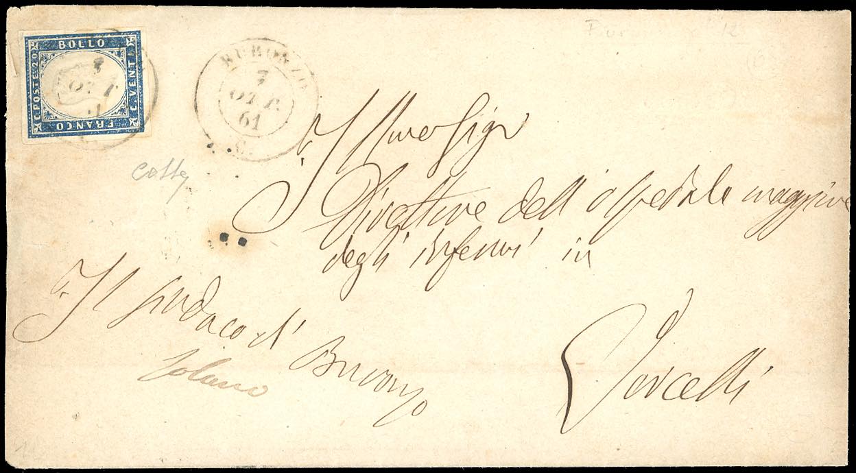 PIEMONTE-BURONZO, punti 12 - 20 cent. (15Dc), perfetto, su sovracoperta di lettera del 7/10/1861 per Vercelli. Raro annullo. Cert. Colla.