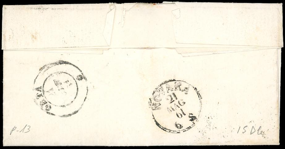PIEMONTE-MIASINO, punti 13 - 20 cent. (15Db), perfetto e ben marginato, su lettera del 21/5/1861 per Novara. Pregevole annullo, di ottima qualità. Cert. Colla.
