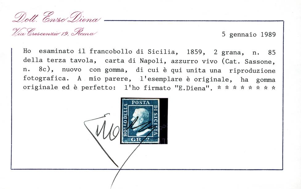 1859 - 2 grana azzurro vivo, III tavola, carta di Napoli (8c), gomma originale, perfetto e molto fresco. Splendido e raro. Em. ed A.Diena, cert. E.Diena e Colla.