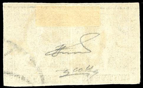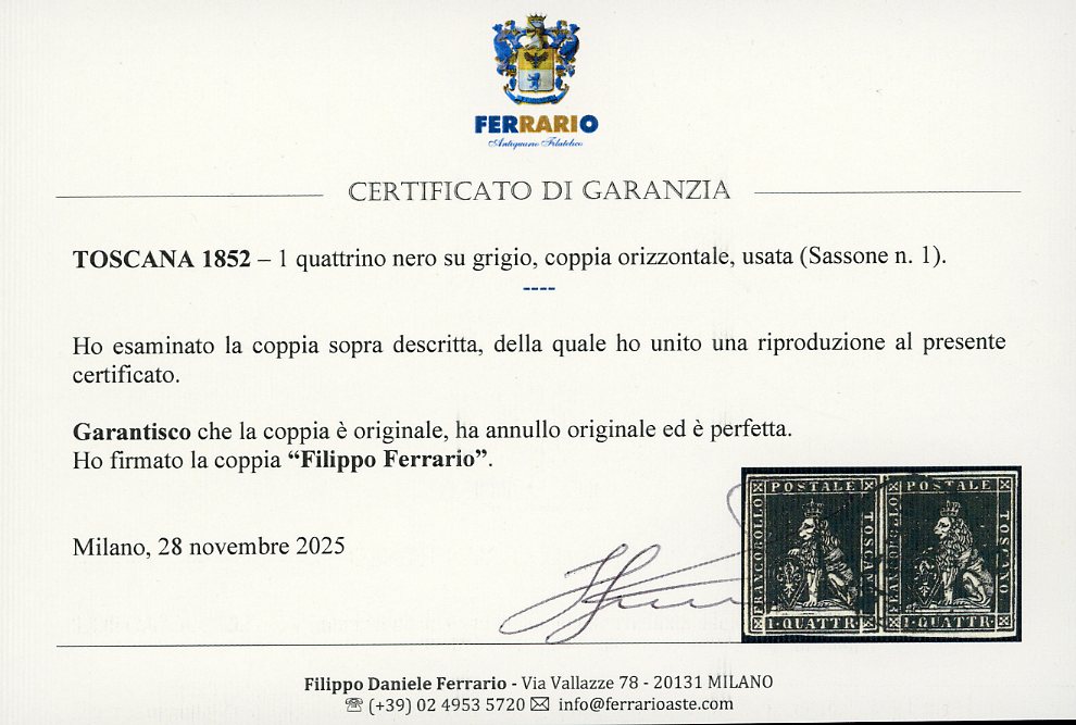 1851 - 1 quattrino nero su grigio (1), coppia orizzontale, usata, perfetta e ben marginata. Molto bella! Colla, cert. Ferrario.