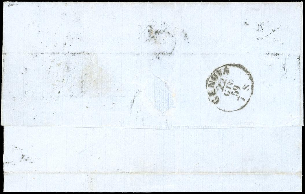 1859 - 1 crazia carminio (12), striscia di tre a seggiola, due francobolli con un margine verticale intaccato, su lettera da Firenze 21/6/1859 a Genova, in PD. Rara affrancatura in periodo di Governo Provvisorio. Em. e A.Diena, cert. Raybaudi.