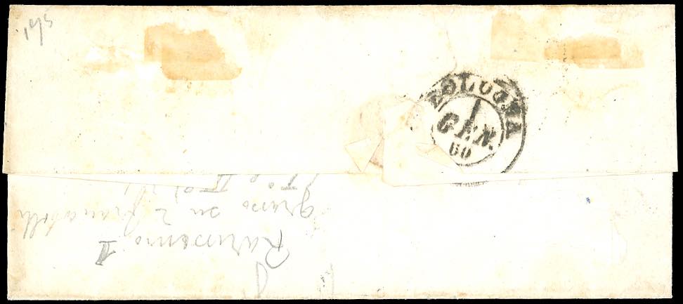 1859 - 1 crazia carminio, II emissione, filigrana linee ondulate (12), tre esemplari, lievi difetti di marginatura, su lettera da Prato 31/12/1859 a Bologna. Affrancatura molto rara nell'ULTIMO GIORNO DI VALIDITA' dei francobolli Granducali in crazie. Insieme eccezionale ed estremamente raro! Cert. Ferrario.