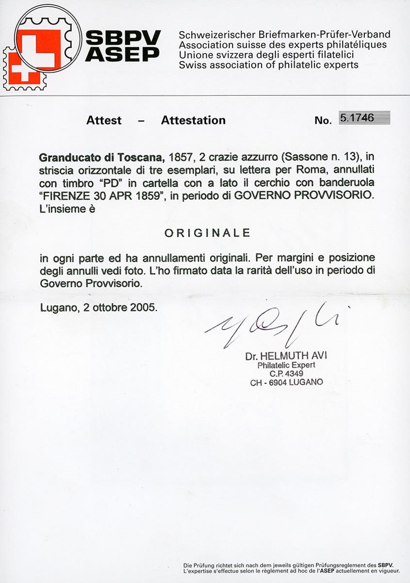 1859 - 2 crazie azzurro (13), striscia orizzontale di tre, tre ottimi margini, sfiorata a sinistra, su lettera da Firenze 30/4/1859 a Roma. Interessante lettera dei primissimi giorni del Governo Provvisorio. Rara. Cert. Avi.