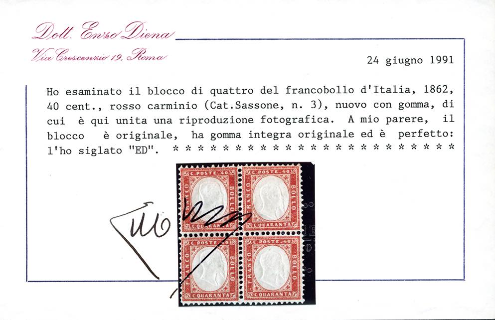 1862 - 40 cent. rosso carminio (3), blocco di quattro, nuovo, ottima centratura, gomma originale integra, perfetto e molto fresco. Cert. E.Diena.