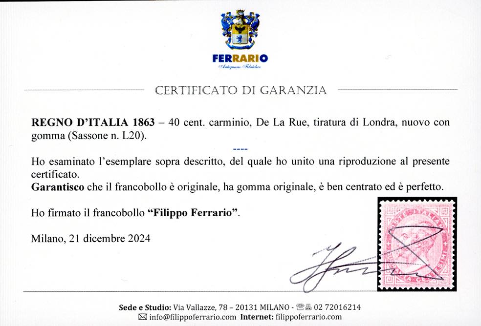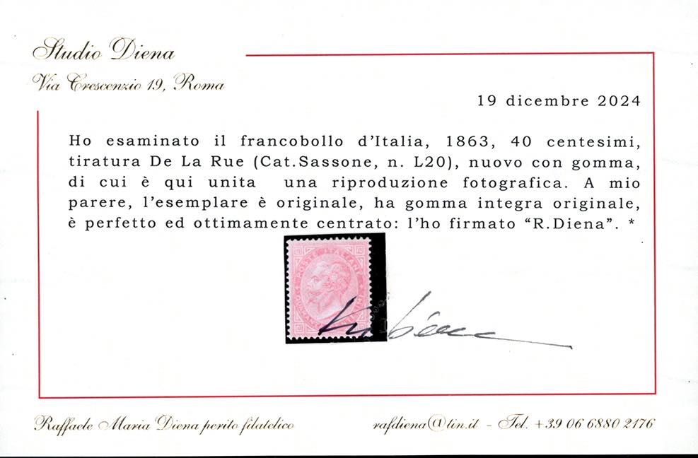 1863 - 40 cent. rosa carminio, De La Rue, tiratura di Londra (L20), ben centrato, nuovo, gomma originale integra, perfetto. Freschissimo e molto raro di questa qualità. Emilio Diena, Giulio Bolaffi, cert. Ferrario e Diena.