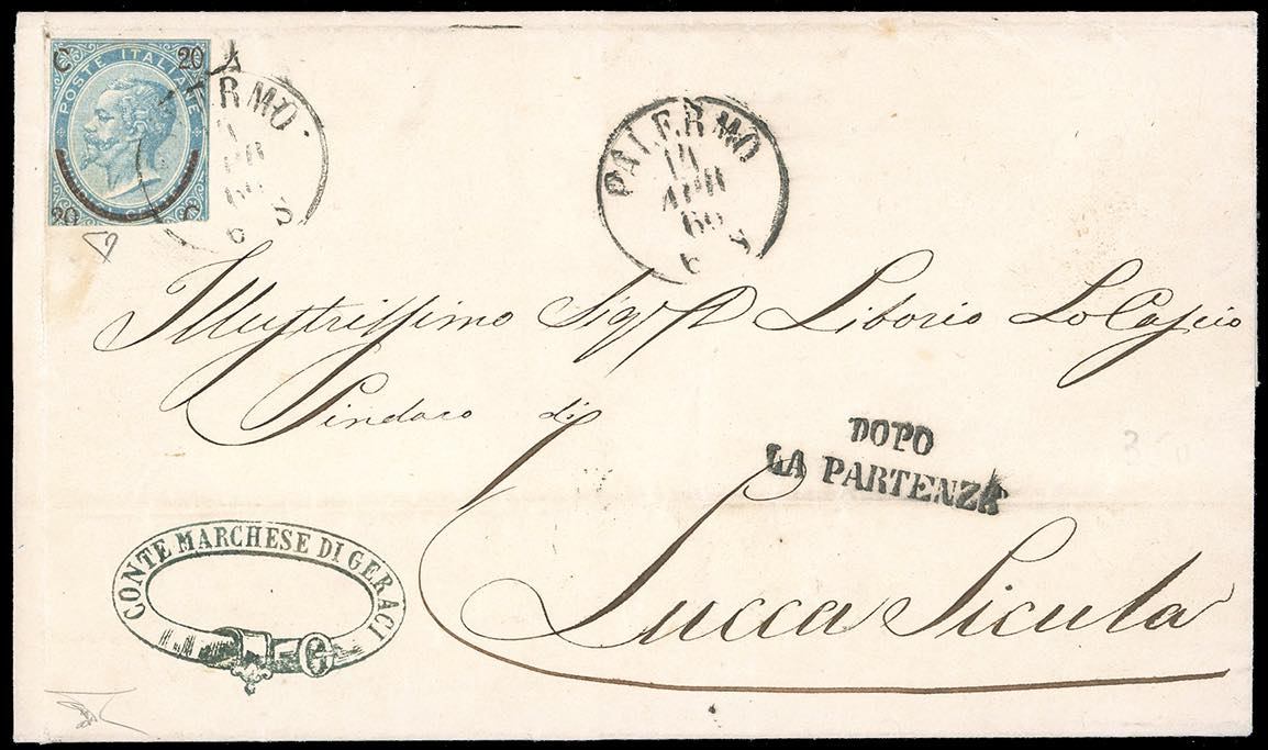 1865 - 20 cent. su 15 cent. Ferro di cavallo, I tipo (23), ritagliato lilliput, dentellatura completamente asportata sui quattro lati, su fresca lettera da Palermo 14/4/1866 a Lucca Sicula. Interessante caso di possibile frode (dentellatura ritagliata per eliminare parti del francobollo già annullate) non scoperta. E.Diena, dettagliato cert. Bottacchi.