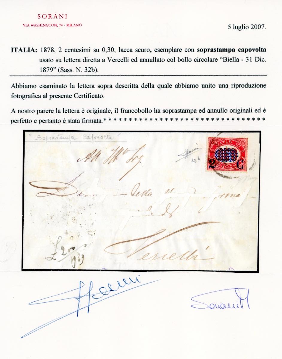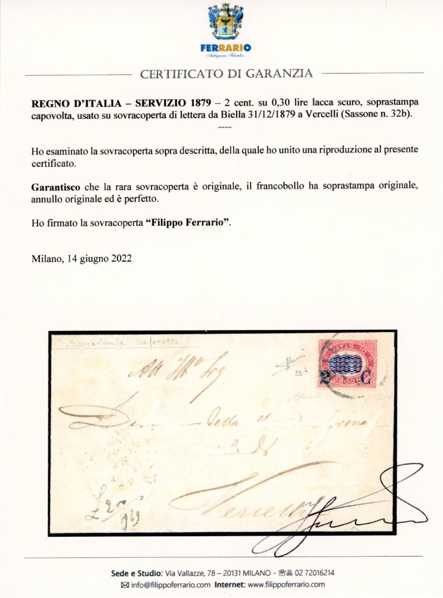 1879 - 2 cent. su 0,30 lire Servizio soprastampati, SOPRASTAMPA CAPOVOLTA (32b), perfetto, isolato su sovracoperta di lettera da Biella 31/12/1879 a Vercelli. Molto rara. G.Oliva, cert. Sorani e Ferrario.