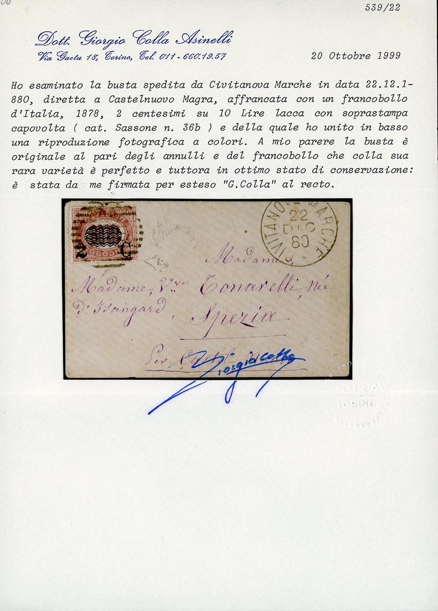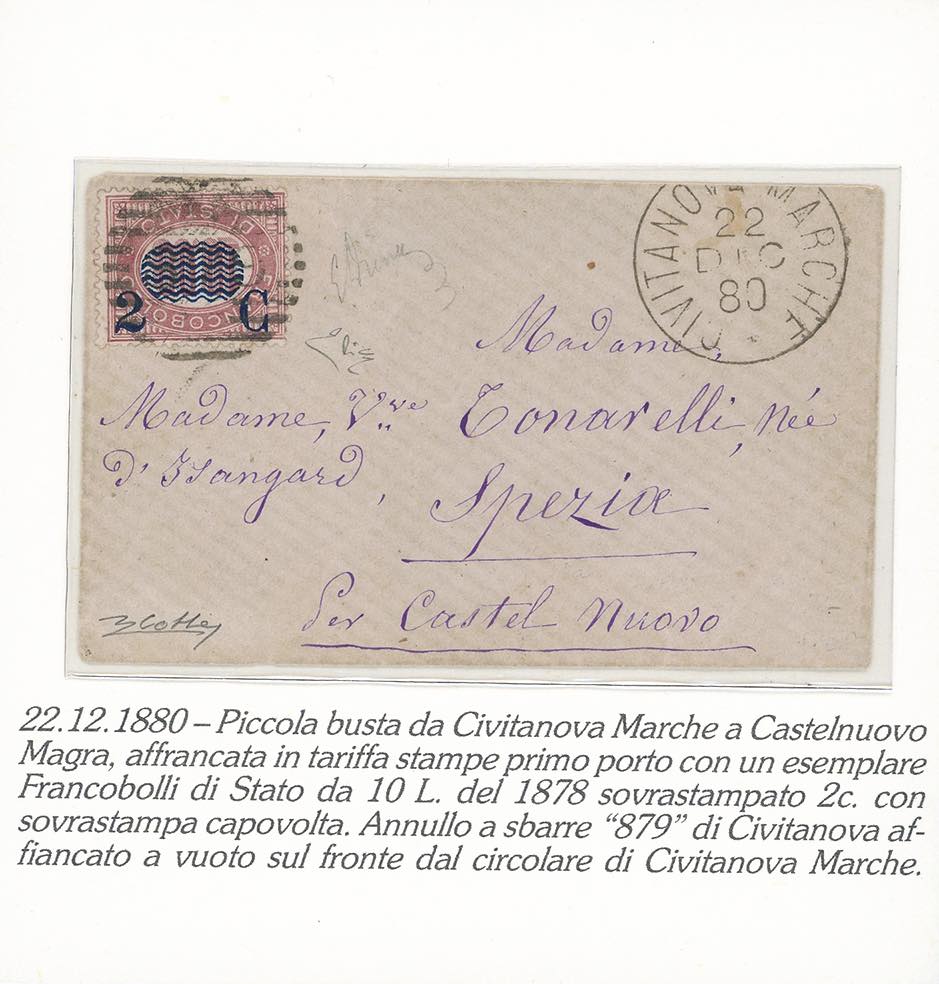 1880 - 2 cent. su 10 lire Servizio soprastampati, soprastampa capovolta (36b), perfetto, su bella bustina da Civitanova Marche 22/12/1880 a Castelnuovo Magra. Rara e di ottima qualità. Em.Diena, cert. E.Diena e Colla.