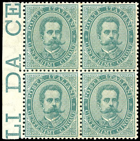 1879 - 5 cent. Umberto I, blocco di quattro, buona centratura per l'emissione, bordo di foglio, nuova, gomma originale integra, perfetta. ... Read more