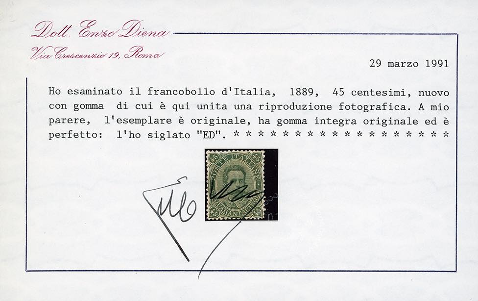1889 - 45 cent. Umberto I (46), ottima centratura, gomma originale integra, perfetto. Raro in queste condizioni qualitative. Cert. E.Diena ... Read more