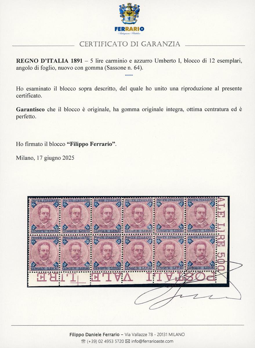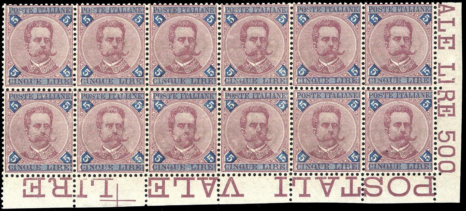 1891 - 5 lire carminio e azzurro Umberto I (64), ottima centratura, blocco di 12 esemplari, angolo di foglio, nuovo, gomma originale ... Read more