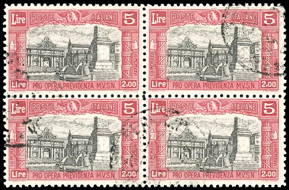 1928 - 5 + 2 lire Milizia II emissione (223), blocco di quattro, usato, perfetto. Raro. A.Diena.