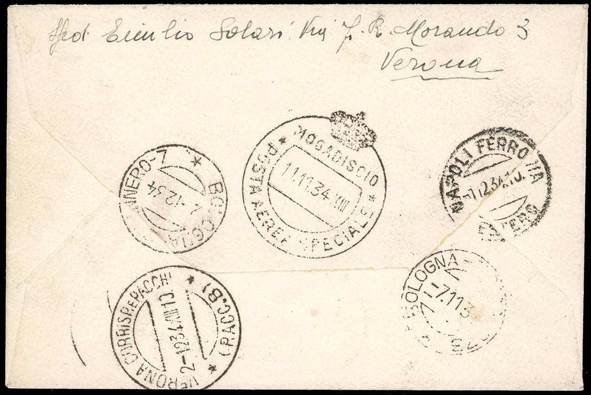 1930 - 10 lire volo Roma-Mogadiscio (88), con complementari, perfetti, su aerogramma raccomandato da Verona 7/11/1934 a Mogadiscio, ... Read more