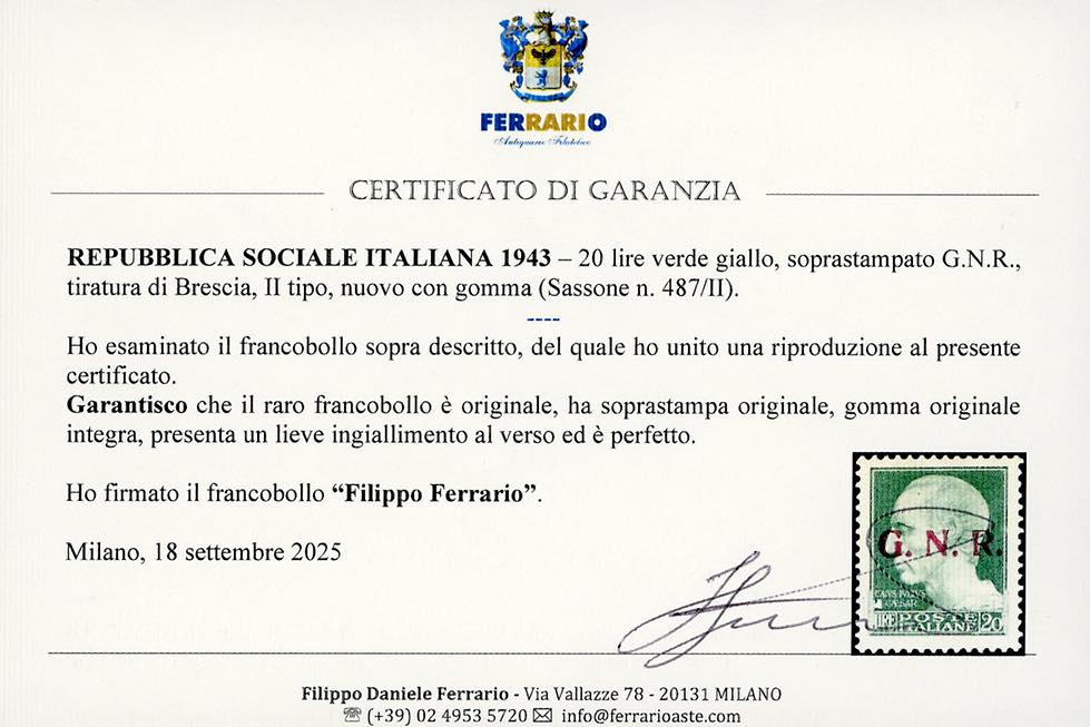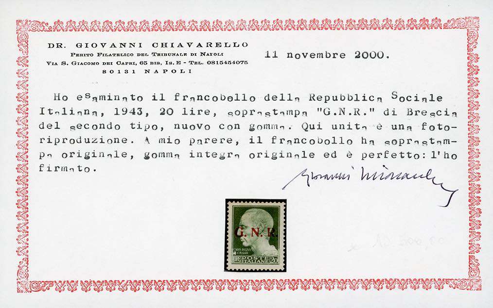 1943 - 20 lire, soprastampa G.N.R. di Brescia, II tipo (487/II), nuovo, gomma originale integra, perfetto, lieve ingiallimento al verso. Raro. Fiecchi, cert. Chiavarello e Ferrario.