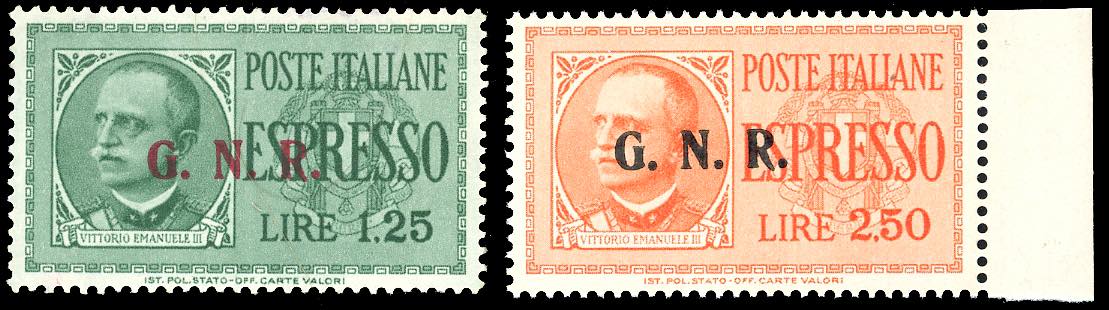 1943 - Soprastampati G.N.R. di Brescia, III tipo, serie completa (19/III-20/III), nuovi, gomma originale integra, perfetti. Cert. Ferrario.