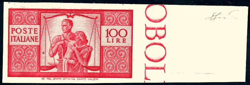 1946 - 100 lire carminio vivo Democratica, non dentellato (565ah), bordo di foglio, gomma originale integra, perfetto. Molto fresco. A.Diena, cert. Ferrario.