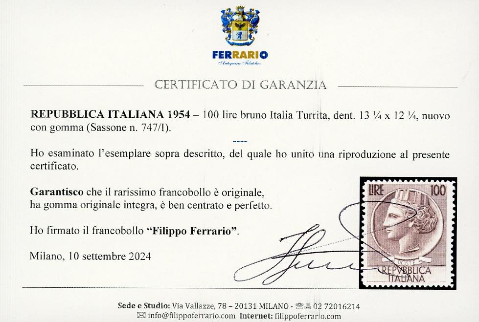 1954 - 100 lire Turrita, dent. 13 1/4 x 12 1/4 (747/I), nuovo, gomma originale integra, perfetto e ben centrato. Molto fresco e rarissimo. Sorani, cert. Ferrario.