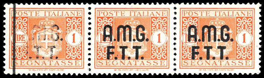SEGNATASSE 1947 - 1 lira soprastampato, striscia orizzontale di tre, il primo esemplare con soprastampa incompleta e spazio tipografico ... Read more