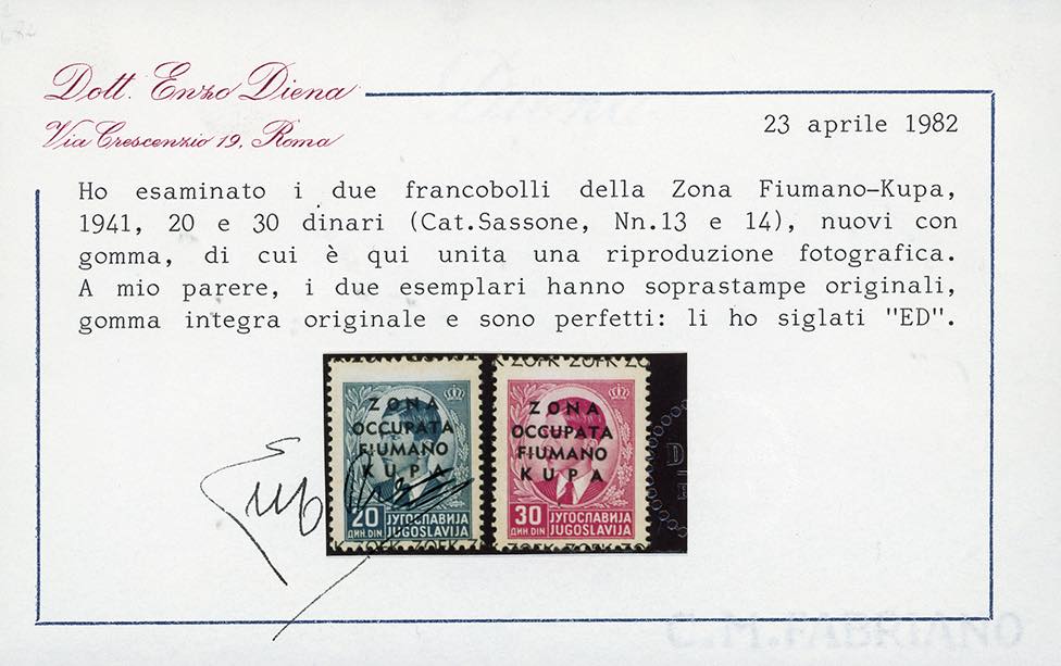 ZONA FIUMANO KUPA 1941 - Soprastampati, serie completa (1/14), nuovi, gomma originale integra, perfetti. Molto rara, solo 46 serie complete note. Cert. E.Diena per i n. 13 e 14, Oro Raybaudi per il n. 14.