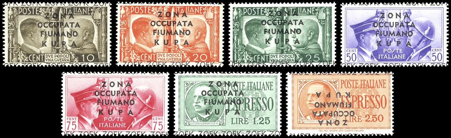 ZONA FIUMANO KUPA 1941 - Asse ed Espressi soprastampati, non emessi, serie completa (25/31), gomma originale integra, perfetti. Splendidi e rarissimi di questa qualità. Tiratura solo 50 serie, di cui poche perfette. Raybaudi, cert. A.Diena e Ferrario.
