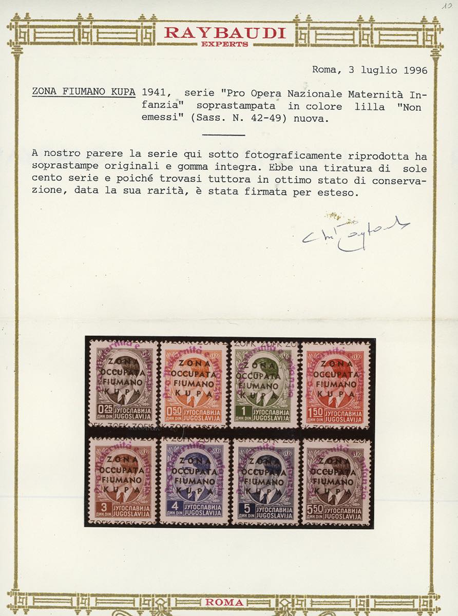 ZONA FIUMANO KUPA 1942 - Pro Opera Nazionale Maternità Infanzia, soprastampa il lilla, non emessi, serie completa (42/49), nuovi, gomma originale integra, perfetti. Rari, tiratura 100 serie. A. ed R.Diena, cert. Oro Raybaudi.