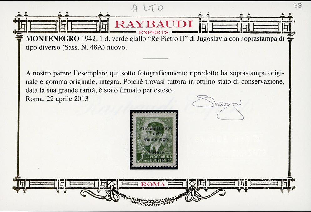 MONTENEGRO 1942 - 1 din. verde, soprastampa di tipo diverso (48A), nuovo, gomma originale integra, perfetto e di ottima qualità. Molto raro, pochissimi esemplari noti. Avi, cert. Oro Raybaudi e Ferrario.
