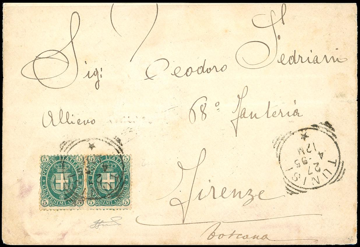 TUNISI 1895 - 5 cent. Stemma (44), coppia buono stato, su busta in TARIFFA RIDOTTA PER MILITARI da Tunisi 27/4/1895 a Firenze, indirizzata ... Read more