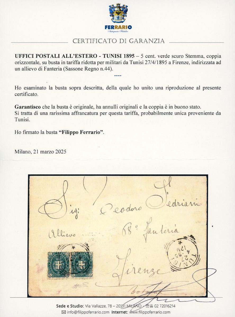 TUNISI 1895 - 5 cent. Stemma (44), coppia buono stato, su busta in TARIFFA RIDOTTA PER MILITARI da Tunisi 27/4/1895 a Firenze, indirizzata ad un allievo di Fanteria. Rarissima affrancatura per questa tariffa, probabilmente unica. Cert. Ferrario.