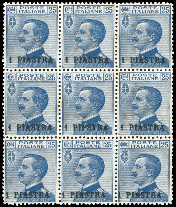 COSTANTINOPOLI 1908 - 1 pi. su 25 cent., II emissione, blocco di nove esemplari con al centro il francobollo con la varietà "PIPSTRA" invece di "PIASTRA" (11d,11), gomma originale integra, perfetto. Cert. E.Diena.
