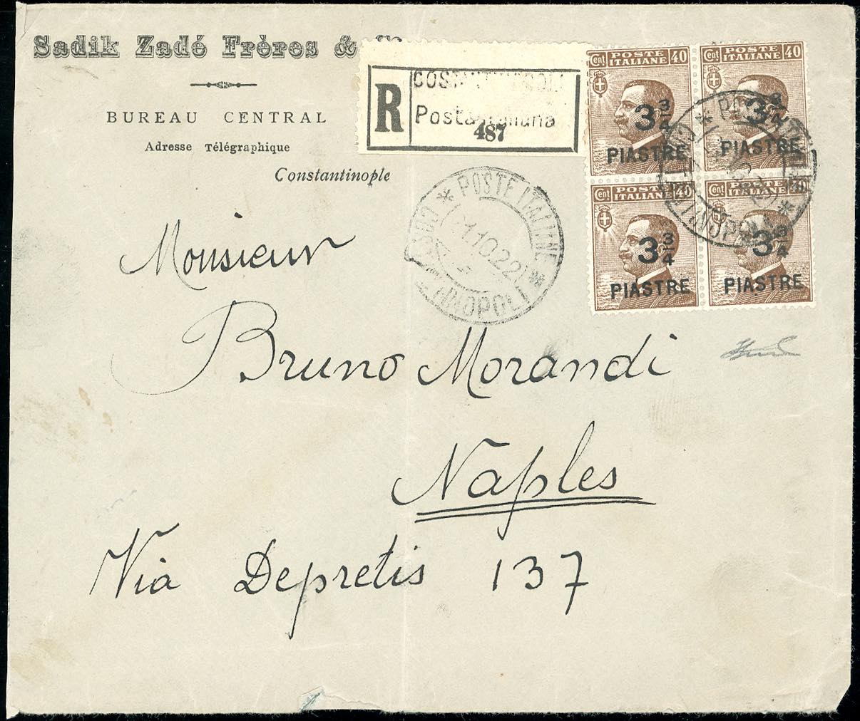 COSTANTINOPOLI 1922 - 3/4 p. su 40 cent., VIII emissione locale (61), blocco di quattro, ottimo stato, su busta raccomandata da Costantinopoli 21/10/1922 a Napoli. Ferrario.