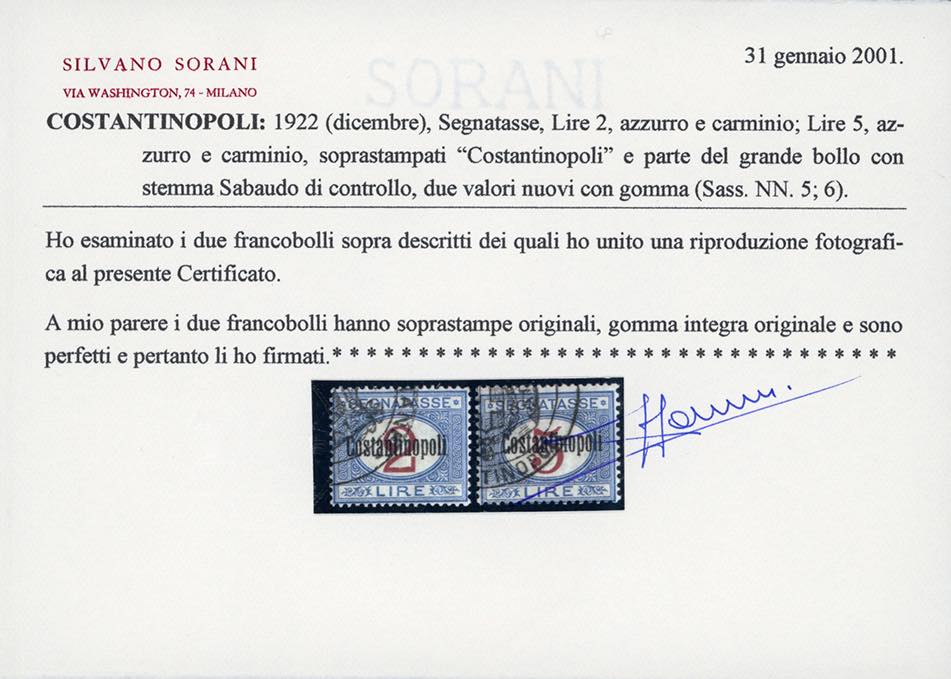 COSTANTINOPOLI SEGNATASSE 1922 - Soprastampati e bollo di controllo, serie completa (1/6), nuovi, gomma originale integra, perfetti. Ottima qualità. Alti valori. A.Diena, cert. Sorani.