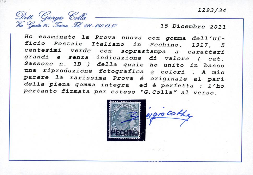 PECHINO 1917 - 5 cent. verde Leoni, soprastampa in caratteri grandi (1B), nuovo, gomma originale integra, perfetto. Splendido e raro. Pochi esistenti. Cert. Colla.