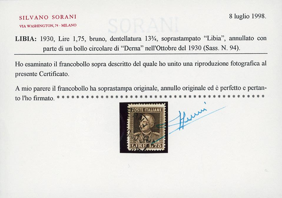 1930 - 1,75 lire bruno Vittorio Emanuele III, dent. 13 3/4 (94), usato, perfetto. Raro e di ottima qualità. A.Diena, cert. Sorani.