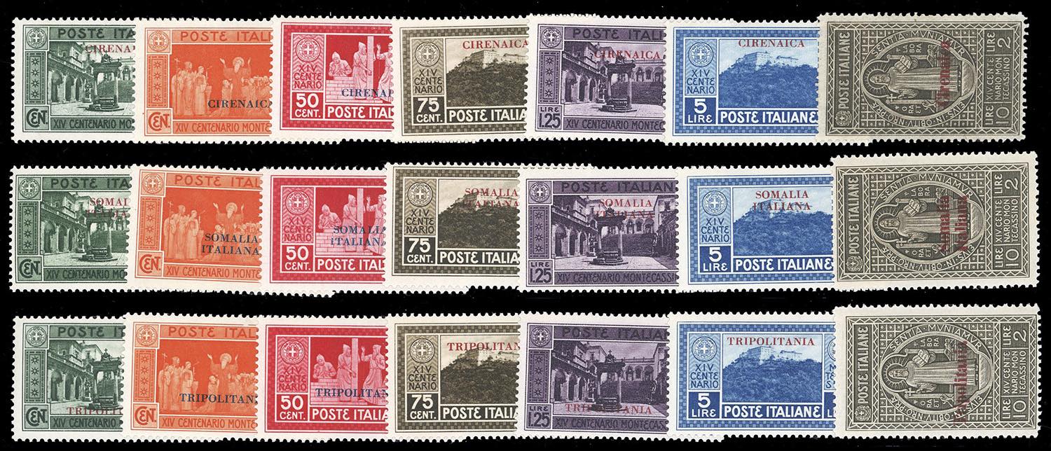 1929 - Montecassino, serie complete di Cirenaica (53/59), Somalia (123/129) e Tripolitania (54/60), nuovi, gomma originale integra, perfetti.