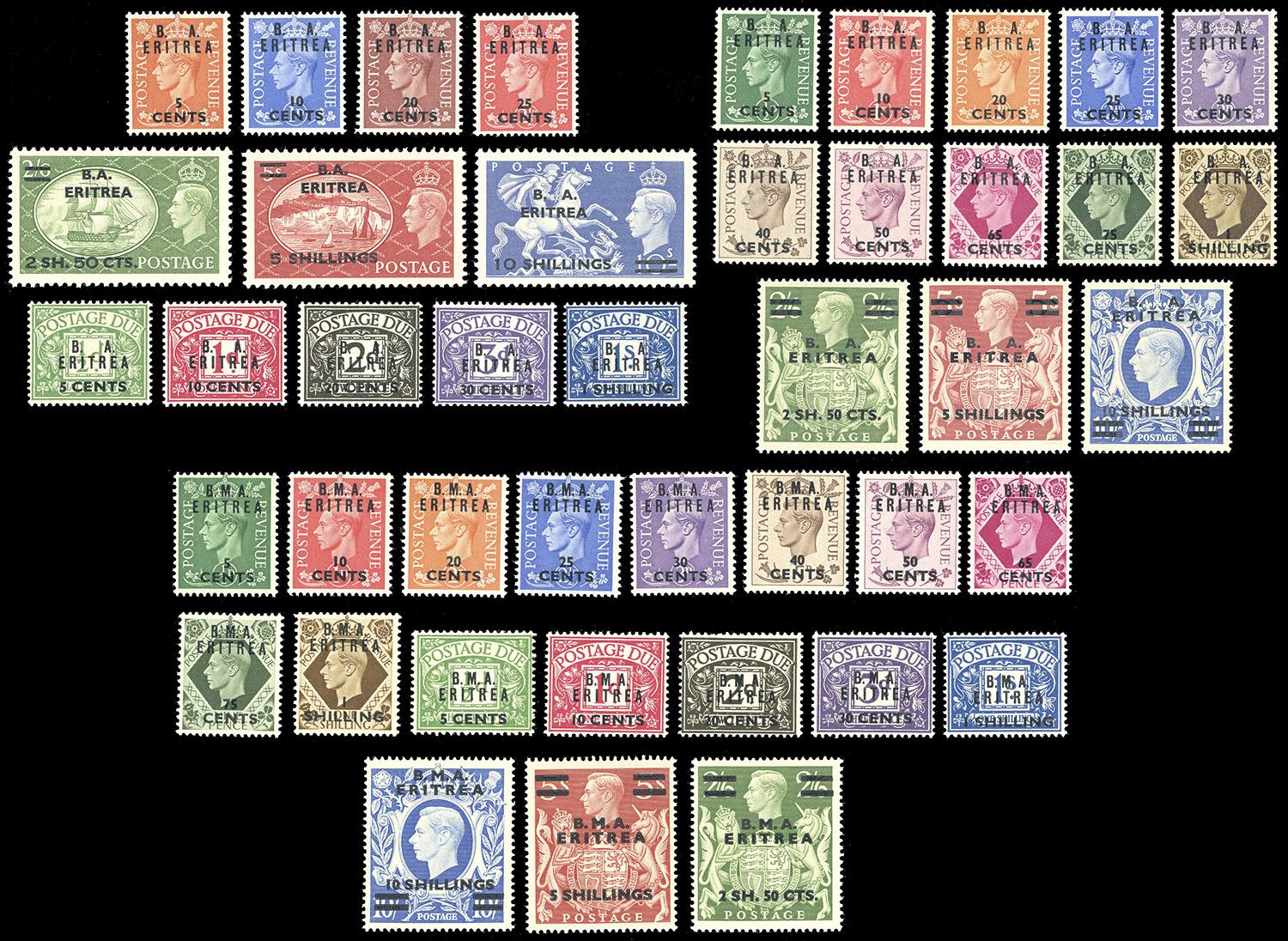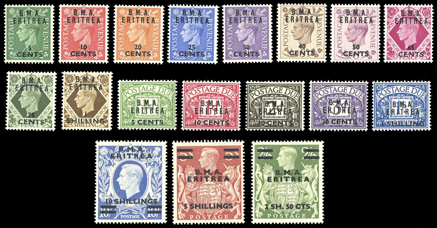 OCCUPAZIONE BRITANNICA ERITREA 1948/51 - Tutte le emissioni di posta ordinaria e segnatasse del periodo (1/13,14/26,27/33,T1/T5,T6/T10), nuovi, gomma originale integra, perfetti.