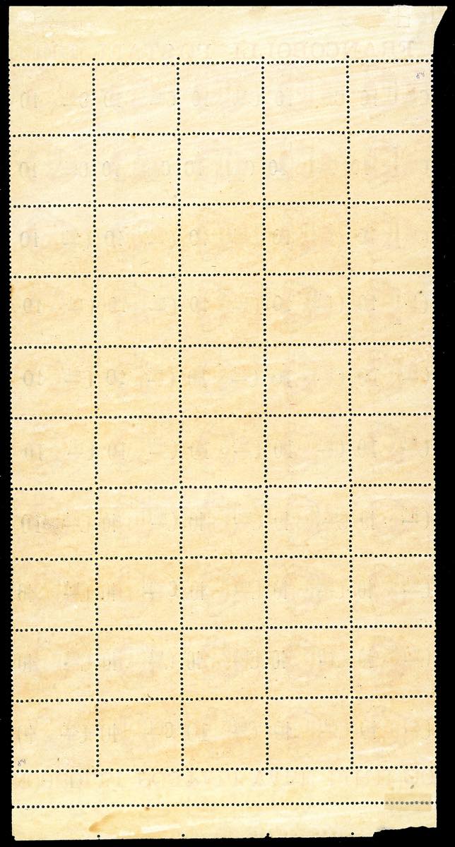 1892 - 10 cent. su 20 cent. soprastampato (10), foglio completo di 50 esemplari, con diverse varietà tipografiche, parte dei francobolli ben centrati, nuovo, gomma originale integra, perfetto. Molto raro. Cert. Ferrario.
