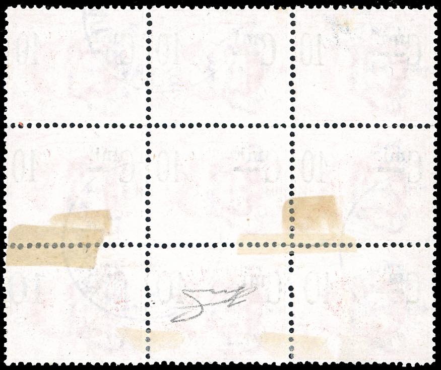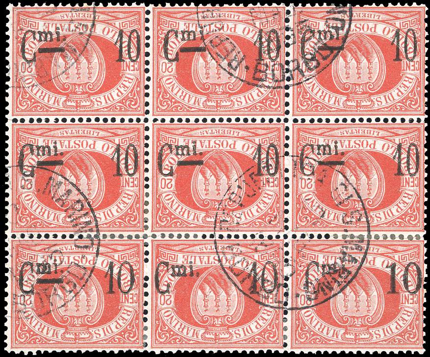 1892 - 10 cent. su 20 cent., blocco di nove esemplari con soprastampa capovolta, uno con otto puntini invece di una linea spessa, uno ... Read more