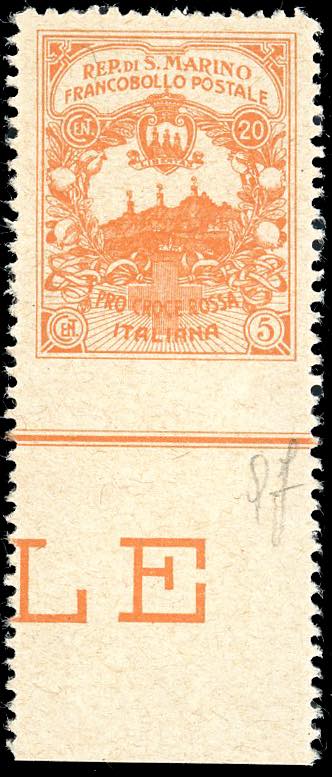 1916 - 20 + 5 cent. Croce Rossa, non emesso, non dentellato in basso (CEI 50Bc, € 2.500), bordo di foglio, nuovo, gomma originale ... Read more