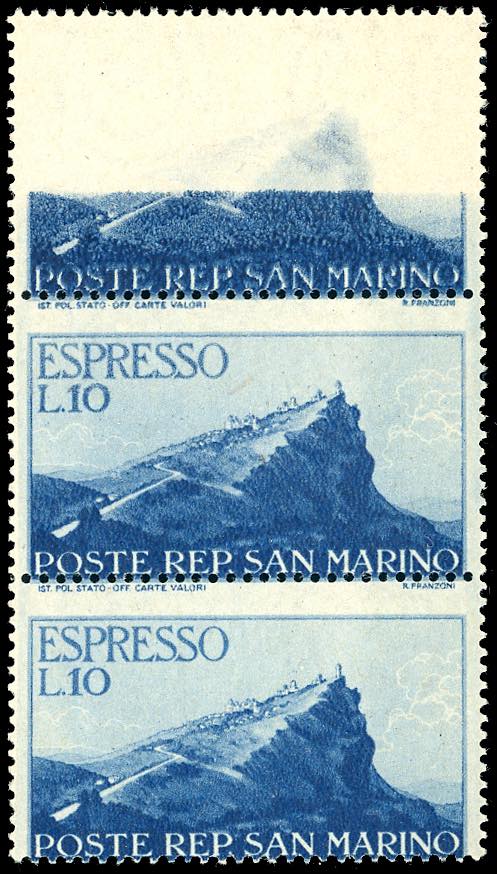 1945/46 - 10 lire Veduta, striscia verticale di tre, il primo esemplare con stampa incompleta o evanescente (14a), dentellatura orizzontale ... Read more