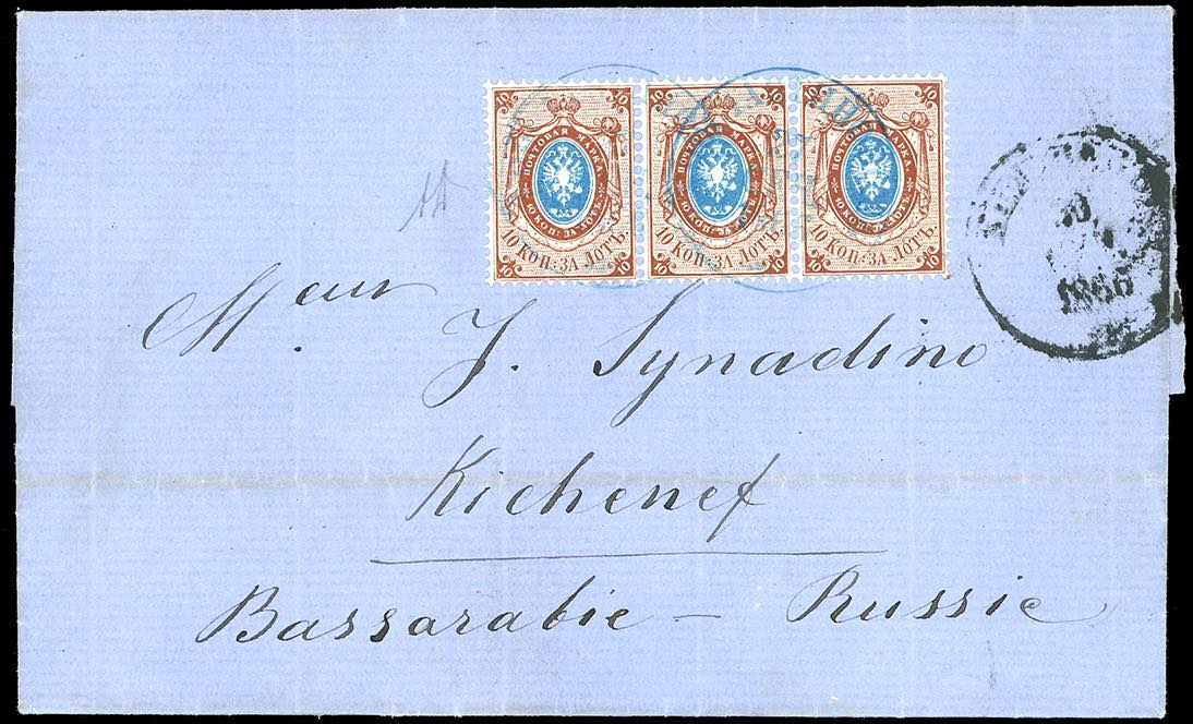 RUSSIA LEVANTE 1866 - 10 k. (Yv.14), striscia orizzontale di tre, perfetta e ben dentellata, dall'Ufficio consolare russo di Costantinopoli 27/9/1866 a Kishinev, in Bessarabia. Rara e di ottima qualità. A.Diena.