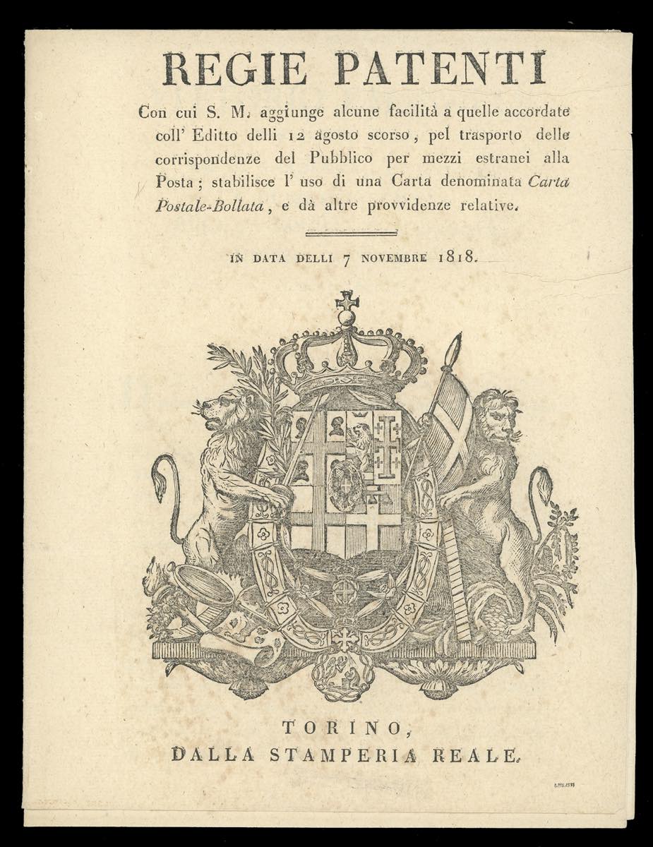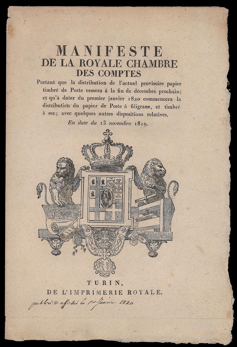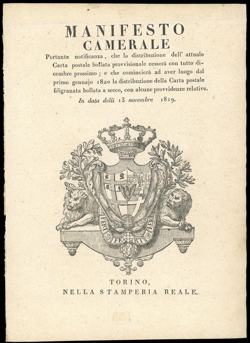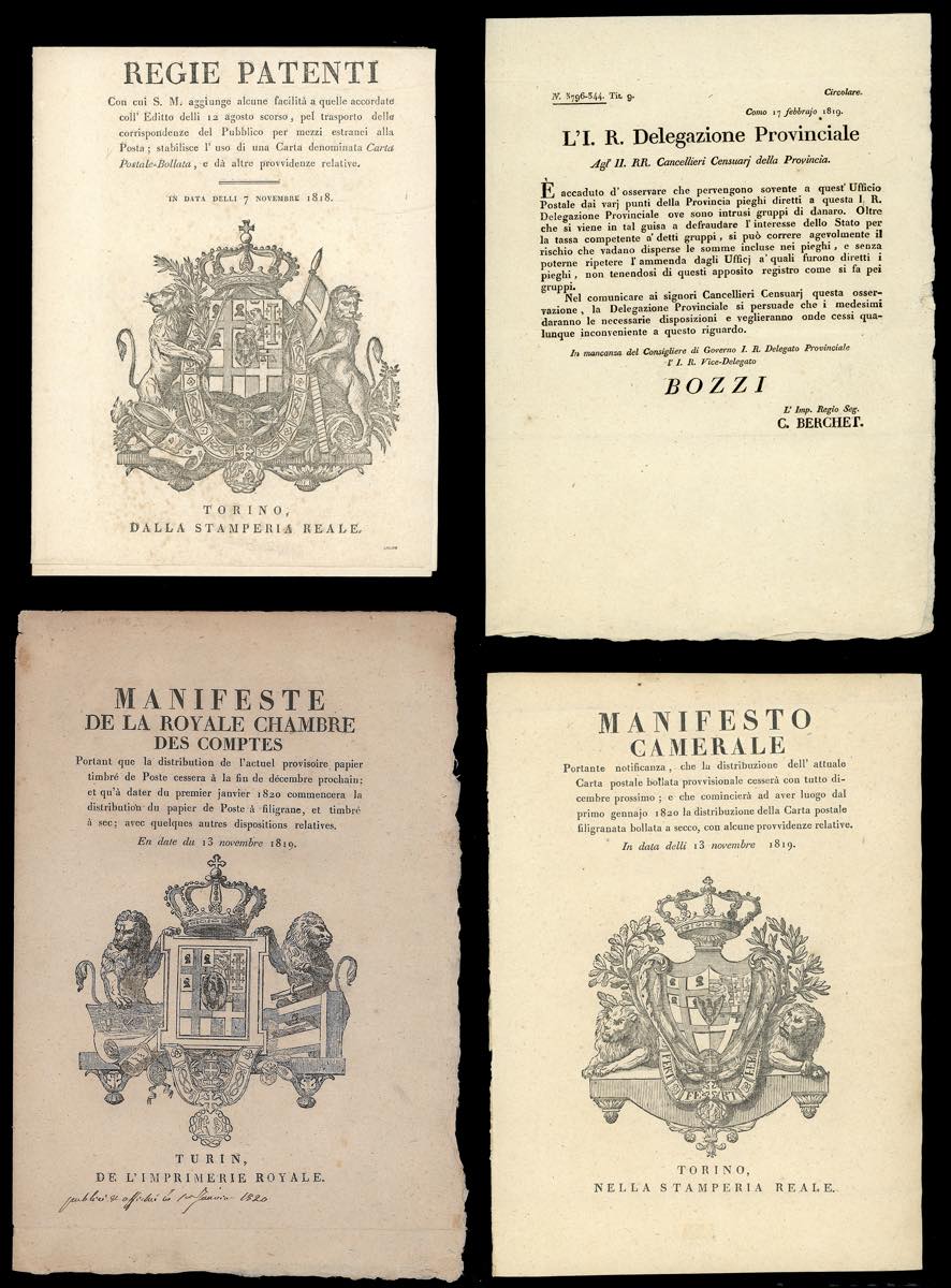 DOCUMENTI 1818/19 - Regia Patente del 7/11/1819 relativa ai Cavallini di Sardegna, rifilata ai margini; una circolare datata Como 17/2/1819 relativa ai gruppi di denaro; le sole copertine dei Manifesti Camerali, in francese ed italiano, del 13/11/1819 relativi ai Cavallini di Sardegna.