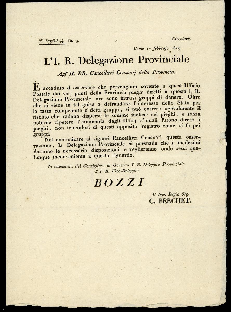 DOCUMENTI 1818/19 - Regia Patente del 7/11/1819 relativa ai Cavallini di Sardegna, rifilata ai margini; una circolare datata Como 17/2/1819 ... Read more