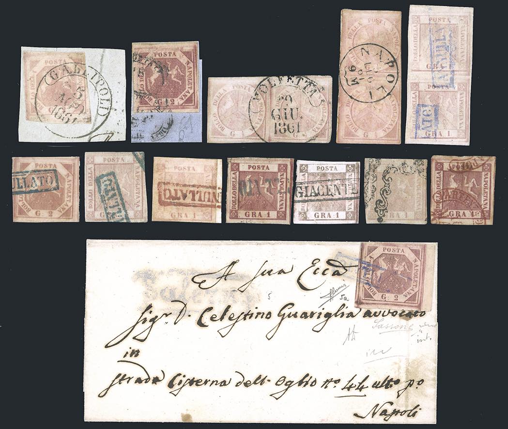NAPOLI 1858/1859 - Piccolo ma interessante insieme di una lettera e quindici esemplari sciolti, tutti con annulli particolari o di colore. Per specialista. Ex coll. Imperato.