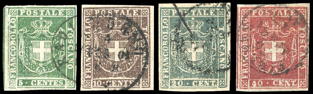 TOSCANA GOVERNO PROVVISORIO 1860 - Quattro esemplari dell'emissione usati, tutti perfetti. Notato 5 cent. con linea di riquadro verticale a sinistra. Qualità lusso, firmati Ferrario.