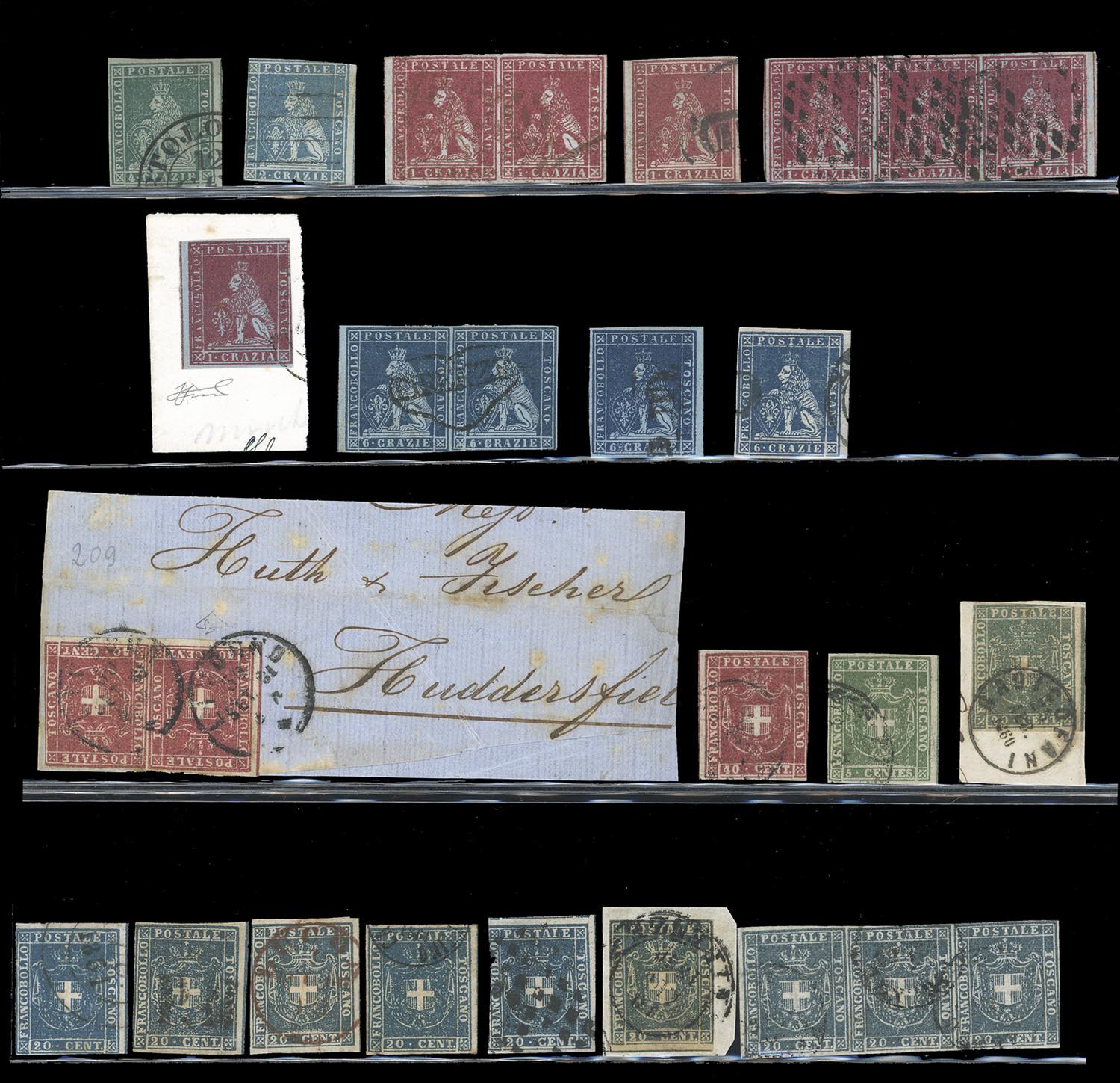 TOSCANA/GOVERNO PROVVISORIO 1851/1860 - Bell'insieme di francobolli, sia in crazie che in centesimi (Governo Provvisorio), con linea di riquadro sul margine di foglio orizzontale o verticale. Insieme estremamente raro, soprattutto per i valori della prima emissione. Ex coll. Imperato.